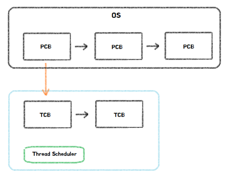 즉, 우리가 흔히 배우는 OS의 스케줄러가 스케줄링 해주는 것은 프로세스의 PCB이고, TCB는 프로세스에 있는 스레드 라이브러리에 의해 스케줄링 되는 것이다.